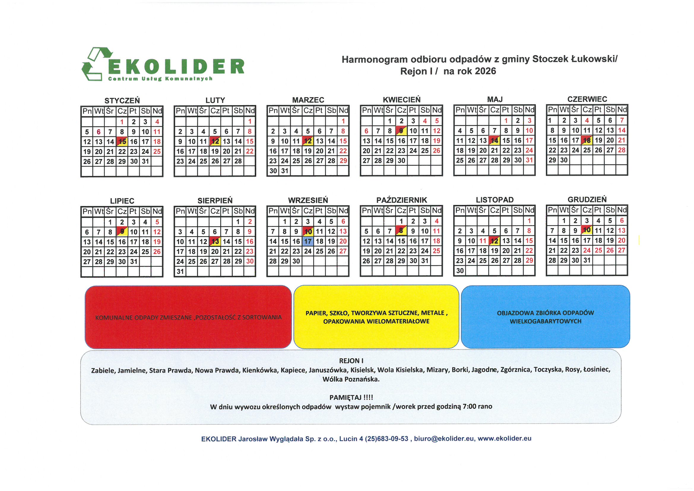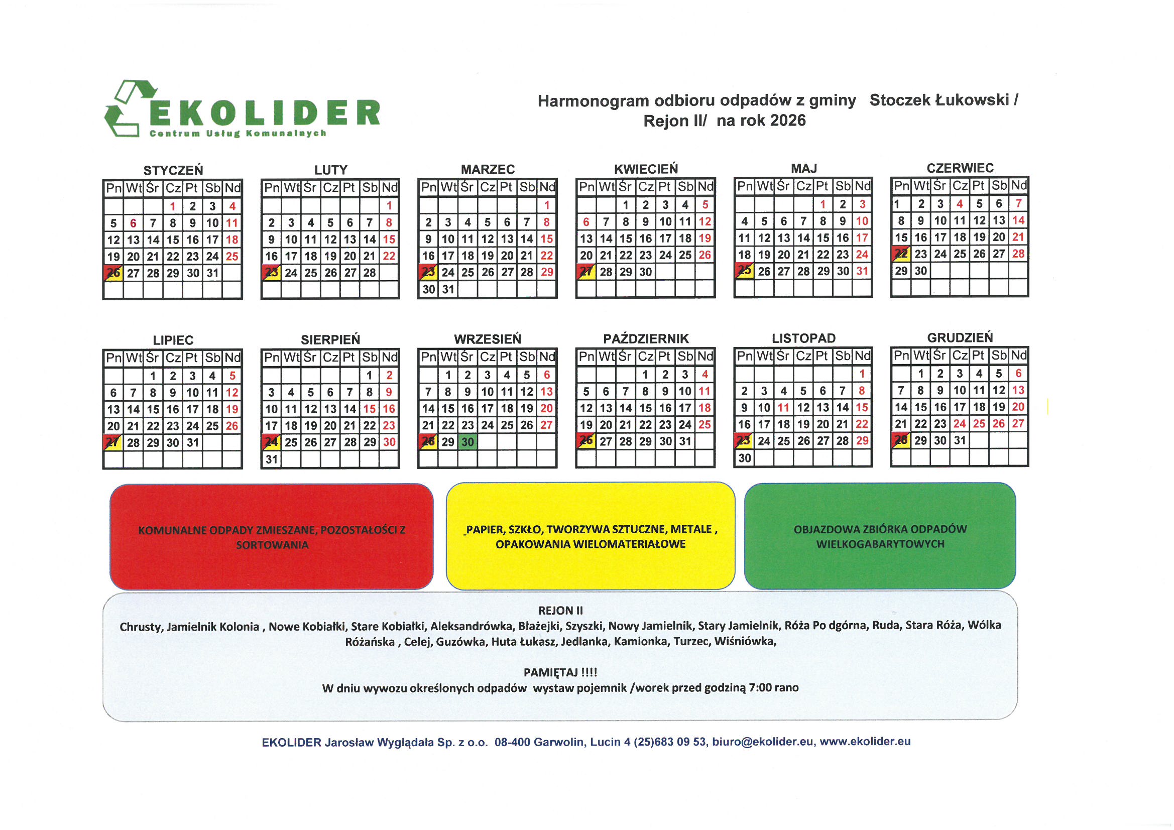 Harmonogram odbioru odpadów w 2026 r.